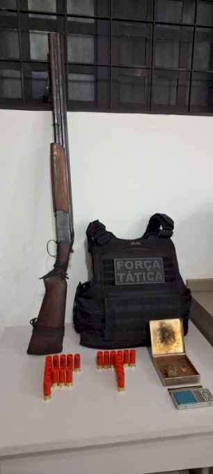 Durante buscas no imóvel, a equipe localizou e apreendeu uma espingarda calibre 12, com dois canos, 24 munições intactas, porções de crack e maconha, além de uma balança de precisão, evidenciando a prática dos crimes de tráfico de drogas (artigo 33 da Lei nº 11.343/2006) e posse irregular de arma de fogo de uso permitido (artigo 12 da Lei nº 10.826/2003).