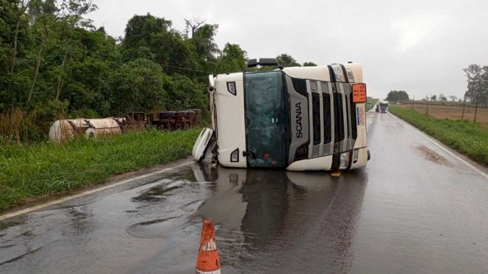 O cavalo mecânico acabou tombando sobre a pista, enquanto a carreta-tanque parou às margens da via, em um barranco.