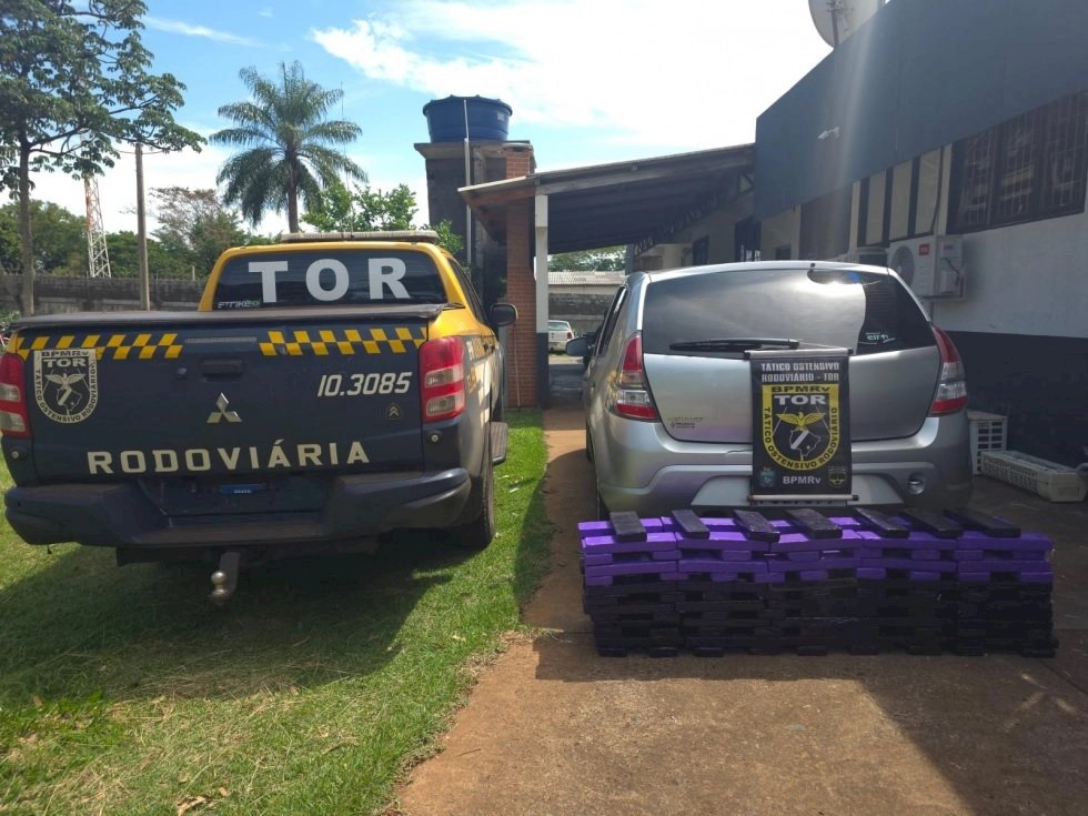 Segundo a corporação, durante a abordagem a um Renault/Sandero de cor prata, conduzido por um homem de 41 anos, os policiais localizaram diversos tabletes de maconha no porta-malas do veículo, que totalizaram 103,300 quilos após a pesagem.